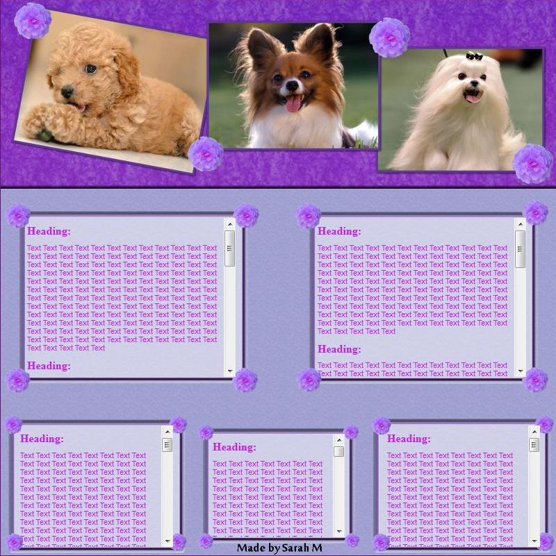 <span style="font-size:85"><span style="color:#0000FF">How many text boxes?: 8<br>Do you want scrolling text?: yes<br>how many pictures?: 3<br>Background color: 5e853f <-- it's a hue code color<br>Colors: 31471f, 735f37<br>Breed: Border Collie & Lab<br>Text color: White or Black (whichever looks best)<br>Text: Kennel of Dreams<br>Co-Text: letting dreams soar free<br>Style/Feel: Whatever looks best<br>Anything Extra?: Thank you </span></span>