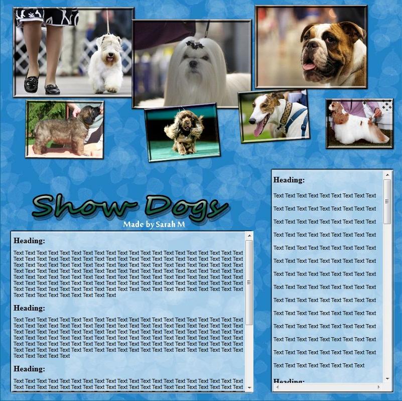 How many text boxes?: 4<br>Do you want scrolling text?: Yes<br>how many pictures?: 4<br>Background color: Blacks, Reds, and Whites<br>Colors: Blacks, Reds, and Whites<br>Breed: Any, but please have the dogs full grown and competing in some sort of event<br>Text color: Any that match<br>Text: Elite Champions<br>Co-Text: Where Champions Are Found<br>Style/Feel: Show dogs, blacks, reds, whites<br>Anything Extra?: None:) other than price?