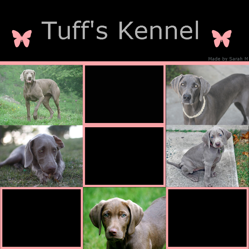 How many text boxes?: 4<br>Do you want scrolling text?: Yes<br>how many pictures?: 5<br>Background color: Black<br>Colors: Pink and grey <br>Breed: Weimaraner <br>Text color: White or grey<br>Text: Tuff's Kennel<br>Co-Text:<br>Style/Feel: Darkish<br>Anything Extra?: Thanks (: